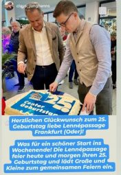 15.04.2025Die Feierlichkeiten zum 25.jährigen Bestehen der Lenné-Passagen waren ein toller Erfolg und verbreiteten Aufbruchstimmung für die mit uns begonnene Revitalisierung der Handels- und Gewerbeflächen.
